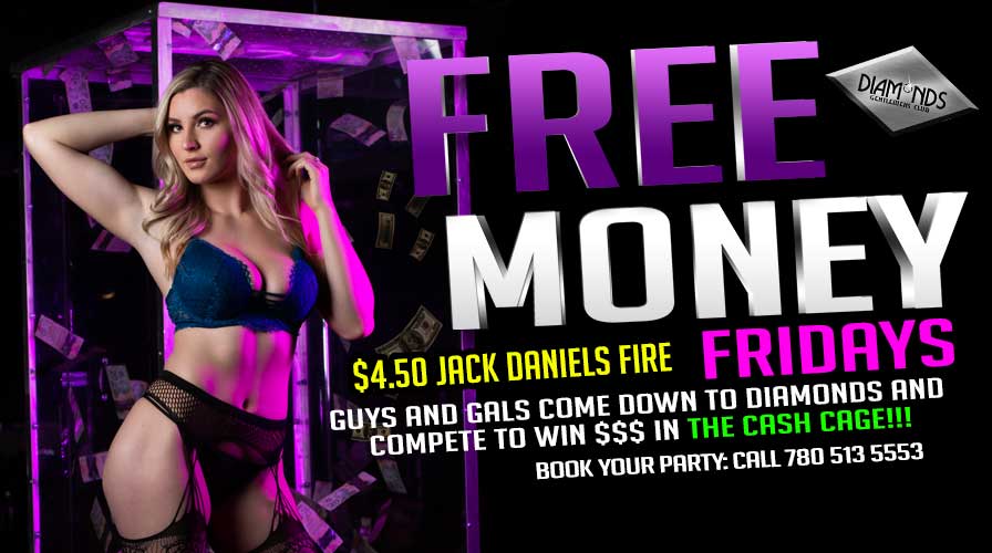 Friday nights at Diamonds are the place to be. Kick off your weekend in style and win free money in the cash cage! If you can catch the money, you can keep it! Plus a chance at winning even more money or extra prizes through the night. Shots of Jack Daniels Fire are on special for $4.50 all night long. As an added bonus all female staff are dressed up in their sexiest lingerie. For a guest list or your chance to book your spot in the cash cage, enter by calling (780) 513-5553 or signup below!